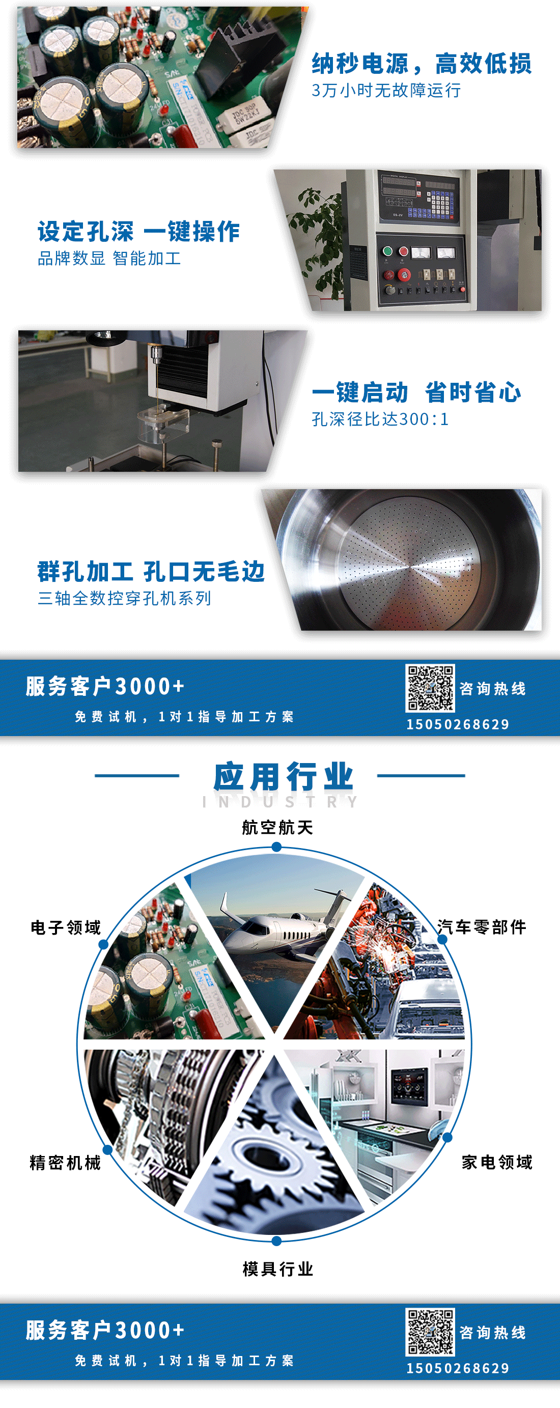 3.0mm,最大深徑比能達300 : 1以上加工速度每分鐘最大可達60mm ,工作臺X、Y軸配有數顯裝置。